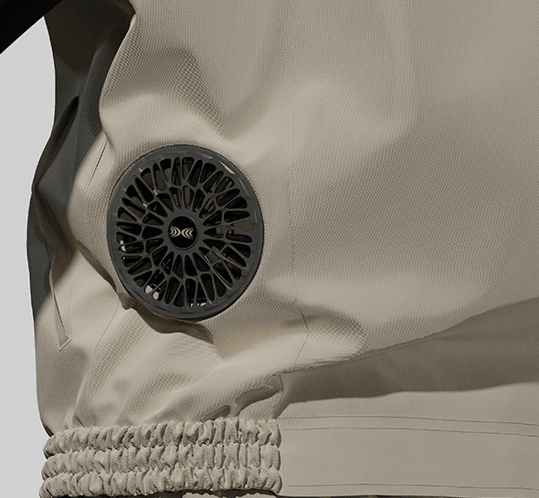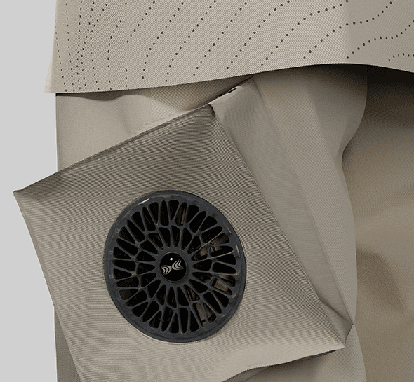 空調服®のファンによって衣服内に取り込まれた大量の空気が肌と生地の間に大きな空間を生み出し、SOLAMENT®の遮熱効果を最大化。近赤外線を大幅にカットしながら、風を流すことで汗の気化を促進させ、屋外での作業を快適に。
