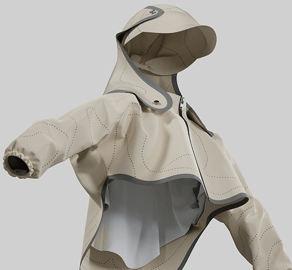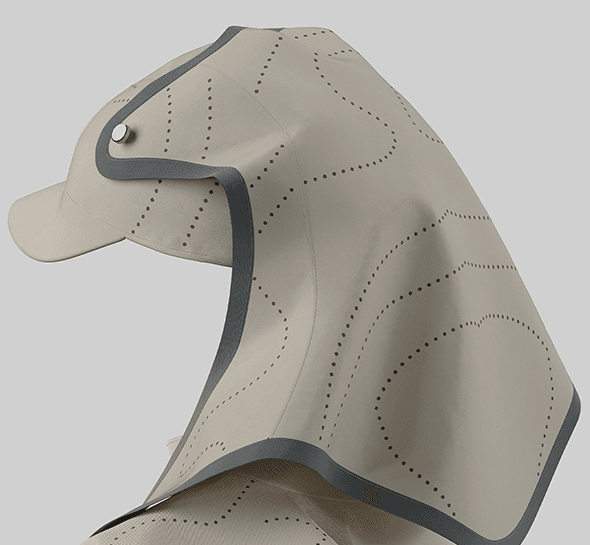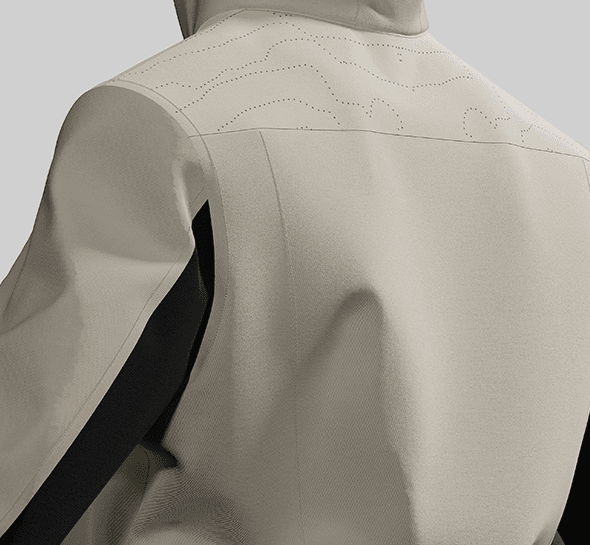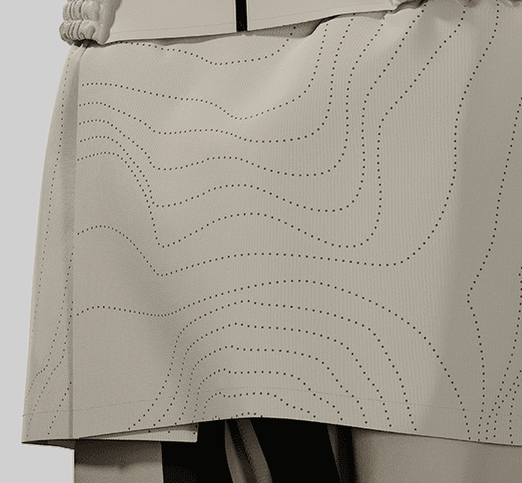 下層にプリーツ加工を施したメッシュ生地を取り入れ、表層と肌に空間をつくり出すことで、SOLAMENT®の遮熱効果を引き上げる。