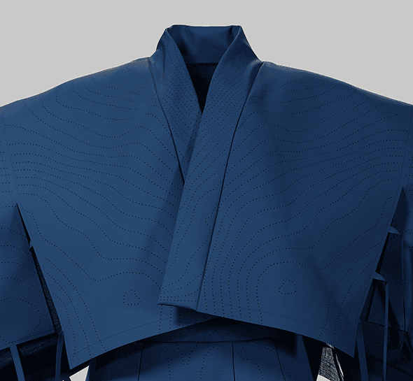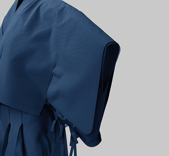 和服の特徴である直線的なパターンに、空気を取り込む大胆なデザインをプラス。