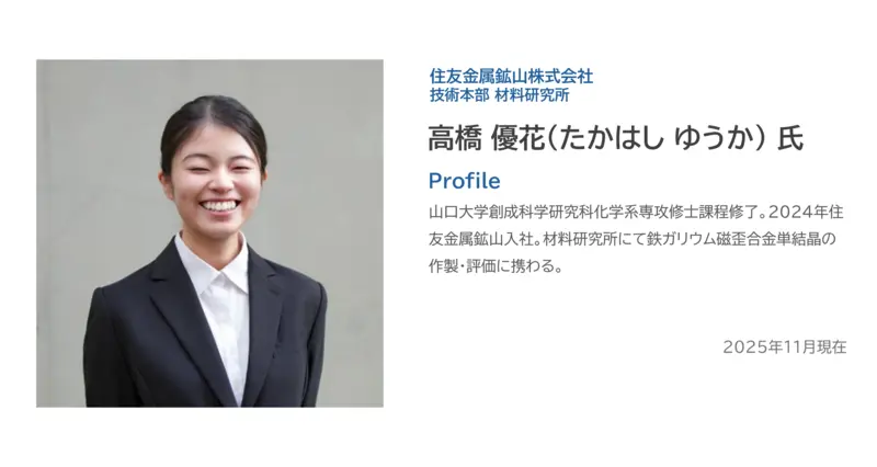 非常に微小な振動から電気を得られるため、老朽化したインフラや工場設備の危険性を検知するなど、さまざまな分野での活用が期待されている振動発電デバイス。その可能性にいち早く着目し先駆的な研究を重ねてきたのが、金沢大学の振動発電研究室です。 住友金属鉱山では、金沢大学振動発電研究室の研究に、独自に開発した単結晶材料「鉄ガリウム磁歪合金単結晶」を提供し、研究活動をサポートしています。金沢大学を訪ね、共同研究のパートナーである北翔太氏、髙村亜由美氏と共に、その可能性を語り合いました。