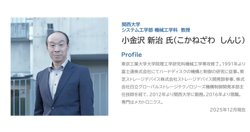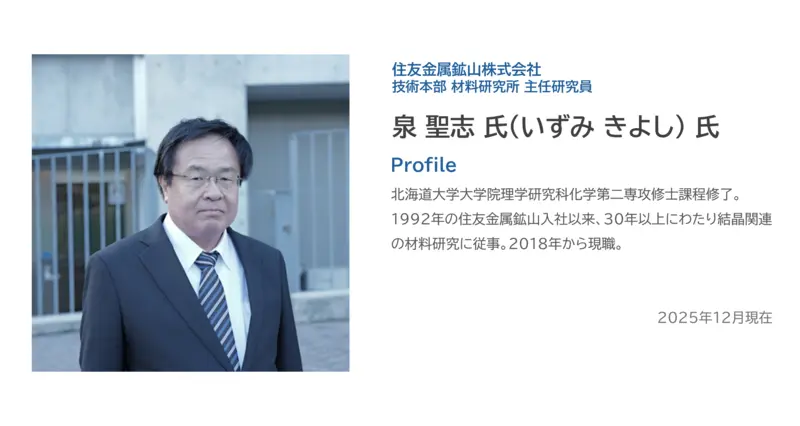 住友金属鉱山では、関西大学システム理工学部機械工学科の小金沢新治教授に、独自に開発した単結晶材料「鉄ガリウム磁歪合金単結晶」を提供し、その研究活動をサポートしています。社会課題の解決に役立つ給電型センシングデバイスの研究について、また産学連携の価値について、小金沢教授と語り合いました。