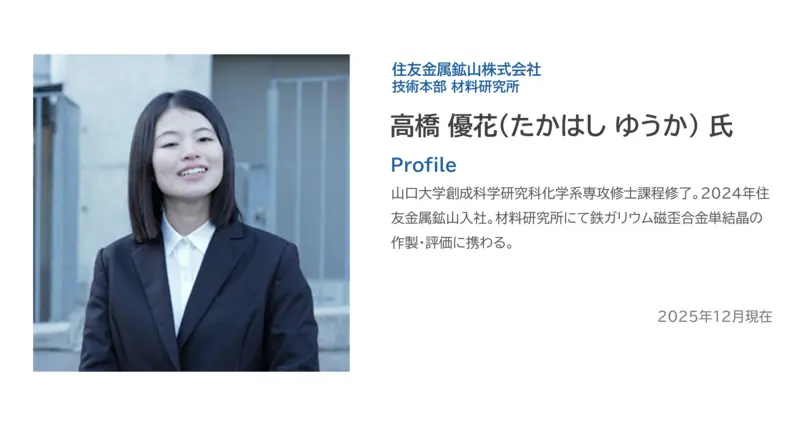 小金沢 私は今、自動車が橋梁を通行する際の振動によって電気を発生させ、その電力で橋の老朽化を診断するセンシングデバイスの研究・開発をしています。そのデバイスにおいて振動を電気信号に変換する部材として、住友金属鉱山の鉄ガリウム磁歪合金単結晶を使っています。